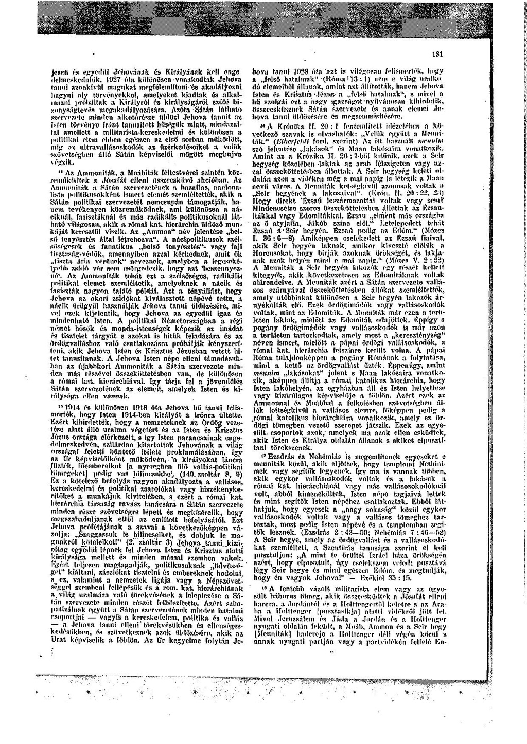 Az Ammoniták, a Moábiták féltestvérei szintén közreműködtek a Jósafát elleni összeesküvő akcióban. Az Ammoniták a Sátán szervezetének a hazafias, naciona­lista politikusokként ismert elemét szemléltették, akik a Sátán politikai szervezetét nemecsupán támogatják, ha­nem tevékenyen közreműködnek, ami különösen a náciknál, fasisztáknál és más radikális politikusoknál lát­ható világosan, akik a római kat. hierarchia üldöző mun­káját keresztül viszik. Az „Ammon" név jelentése „bel­ső tenyésztés által létrehozva". A nácipolitikusok szél­sőségesek és fanatikus „belső tenyésztés"- vagy faji tisztaság-védők, amennyiben azzal kérkednek, amit ők „tiszta ária vérűnek" neveznek, amelyben a legcseké­lyebb zsidó vér sem csörgedezik, hogy azt 'beszennyez­né'. Az Ammoniták tehát ezt a szélsőséges, radikális politikai elemet szemléltetik, amelyeknek a nácik és fasiszták nagyon találó példái. Azt a tényállást, hogy Jehova az ókori zsidókat kiválasztott népévé tette, a nácik ürügyül használják Jehova tanúi üldözésére, mi­vel ezek kijelentik, hogy Jehova az egyedül igaz és mindenható Isten. A politikai Németországban a régi német hősök és monda-istenségek képezik az imádat és tisztelet tárgyát s azokat is hitük feladására és az ördögvalláshoz való csatlakozásra próbálják kényszerí­teni, akik Jehova Isten és Krisztus Jézusban vetett hi­tet tanúsítanak. A Jehova Isten népe elleni támadásuk­ban az újabbkori Ammoniták a Sátán szervezete min­den más részével összeköttetésben van, de különösen a római kat. hierarchiával. Így tárja fel a jövendölés Sátán szervezetének az elemeit, amelyek Isten és ki­rálysága ellen vannak.