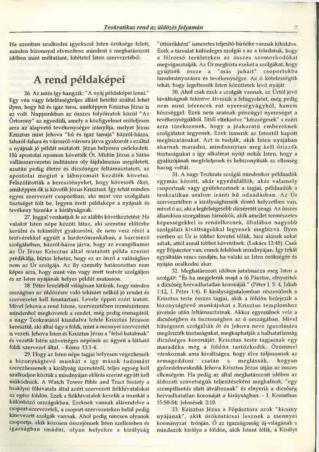 "úttörőkként" ismeretes teljesítő-hírnöke vannak kiküldve. Ezek a társulat különleges szolgái s az a feladatuk, hogy a félreeső területeken az összes szomorkodókat megvigasztalják. Az Úr megbízta ezeket a szolgákat, hogy gyűjtsék össze a "más juhait" csoportokba tanulmányozásra és tevékenységre. Az ő kötelességük tehát, hogy legeltessék Isten közöttetek levő nyáját. 30. Ahol csak ezek a szolgák vannak, az Úrtól jövő kiváltságnak tekintve átveszik a felügyeletet, még pedig nem mint bérencek rút nyereségvágyból, hanem készséggel. Ezek nem aratnak pénzügyi nyereséget a tevékenységükből. Ettől eltekintve "készségesek" s ezért arra törekszenek, hogy a jóakaratú embereknek szolgálatot tegyenek. Ezek ismerik az Istentől kapott megbízatásukat. Azt is tudják, akik Isten nyájában akarnak maradni, mindannyian meg kell őrizzék tisztaságukat s így alkalmat nyújt nekik Isten, hogy a gyalázójának megfeleljenek és bebizonyítsák az ellenség hazug voltát. 31. A nagy Teokrata szolgái mindenkor példaadók egymás között, akár egyedülállók, akár valamely csoportnak vagy gyülekezetnek a tagjai, példaadók a teokratikus uralom iránti hű odaadásban. Az Úr szervezetében a királysághirnök döntő helyzetben van, mivel ő az, aki a legfelségesebb dícséretét zengi. Az összes állandóan szorgalmas hírnökök, akik amellet természetes képességekkel is rendelkeznek, általában nagyobb szolgálati kiváltságokkal legyenek megbízva. Ilyen esetben az Úr is többet követel tőlük, hisz akinek sokat adtak, attól annál többet követelnek. (Lukács 12:48). Csak egy Főpásztor van; ennek felelősek mindnyájan. így tehát egyáltalán nincs rendjén, ha valaki az Isten örökségén és nyáján uralkodni akar. 32. Meghatározott időben jutalmazza meg Isten a szolgáit: "És ha megjelenik majd a fő Pásztor, elnyeritek a dicsőség hervadhatatlan koronáját." (Péter I. 5: 4, Jakab 1:12, I. Péter 1:4). E királyságjutalomban részesülnek a Krisztus teste összes tagjai, akik a földön befejezik a bizonyságtevő munkájukat s Krisztus templomhoz jövetele után feltámasztatnak. Akkor egyesülnek vele a dicsőségben és tisztességben az ő országában. Mivel hűségesen szolgálták őt és Jehova neve igazolására megőrizték tisztaságukat, megkaphatják a halhatatlanság dicsőséges koronáját. Krisztus teste tagjainak egy maradéka még a földön tartózkodik. Örömmel várakoznak ama kiváltságra, hogy élve túljussanak az armageddoni csatán s meglássák, hogyan győzedelmeskedik Jehova Krisztus Jézus útján az összes ellenségein. Ha pedig az által meghatározott időben az áldozati szövetségük teljesítéseként meghalnak, "egy szempillantás alatt átváltoznak" és elnyerik a dicsőség hervadhatatlan koronáját a kiráyságban. - I. Korinthus 15:50-54; Jelenések 2:10. 33. Krisztus Jézus a Főpásztora azok "kicsiny nyájának", akik örököstársai lesznek a mennyei kormányzat trónján. Ő az igazságosság új-világának s mindazok királya a földön, akik Istent félik, a Királyt