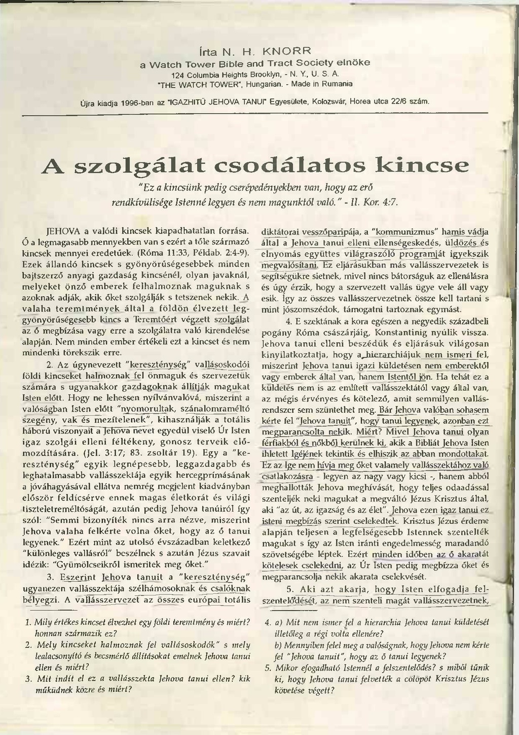 1. Mily értékes kincset élvezhet egy földi teremtmény és miért? honnan származik ez? 2. Mely kincseket halmoznak fel vallásoskodók" s mely lealacsonyító és becsmérlő állításokat emelnek Jehova tanúi ellen és miért? 3. Mit indít el ez a vallásszekta Jehova tanúi ellen? kik műküdnek közre és miért?