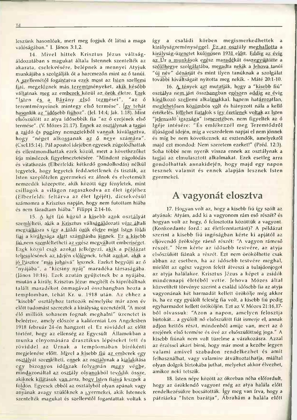 Mivel hittek Krisztus Jézus váltságáldozatában s magukat általa Istennek szentelték az akarata, cselekvésére, belépnek a mennyei Atyjuk munkájába s szolgálják őt a harcmezőn mint az ő tanúi. A szellemétől fogantatva ezek most az Isten szellemi fiai, megelőznek más, teremtményeket, akik később váltatnak meg az emberek közül az örök életre. Ezek "Isten és a Bárány első termései", "az ő teremtményeinek mintegy első termése". Így tehát hasonlók az "idősebb fiúhoz". (Jel. 14:4; Jak. 1:18). Mint elsőszülött az atya idősebbik fia "az ő erejének első termése". (V. Mózes 21:17). Ennek az osztálynak a tagjai a zsidó és pogány nemzetekből vannak kiválasztva, hogy "népet alkossanak az Ő neve számára". (Csel. 15:14). Pál apostol idejében egyesek zúgolódhattak és ellentmondhattak ezek közül, mert a következőket írja mindezek figyelmeztetésére. "Mindent zúgolódás és vitatkozás (Elberfeldi: kétkedő gondolkodás) nélkül tegyetek, hogy legyetek feddhetetlenek és tiszták, az Isten szeplőtelen gyermekei ez álnok és elvetemült nemzedék közepette, akik között úgy fényletek, mint csillagok a világon ragaszkodva az élet igéjéhez (Elberfeldi: feltárva az élet Igéjét), dicsekvésül számomra a Krisztus napján, hogy nem futottam hiába és nem fáradtam hiába." Filippi 2:14-16.