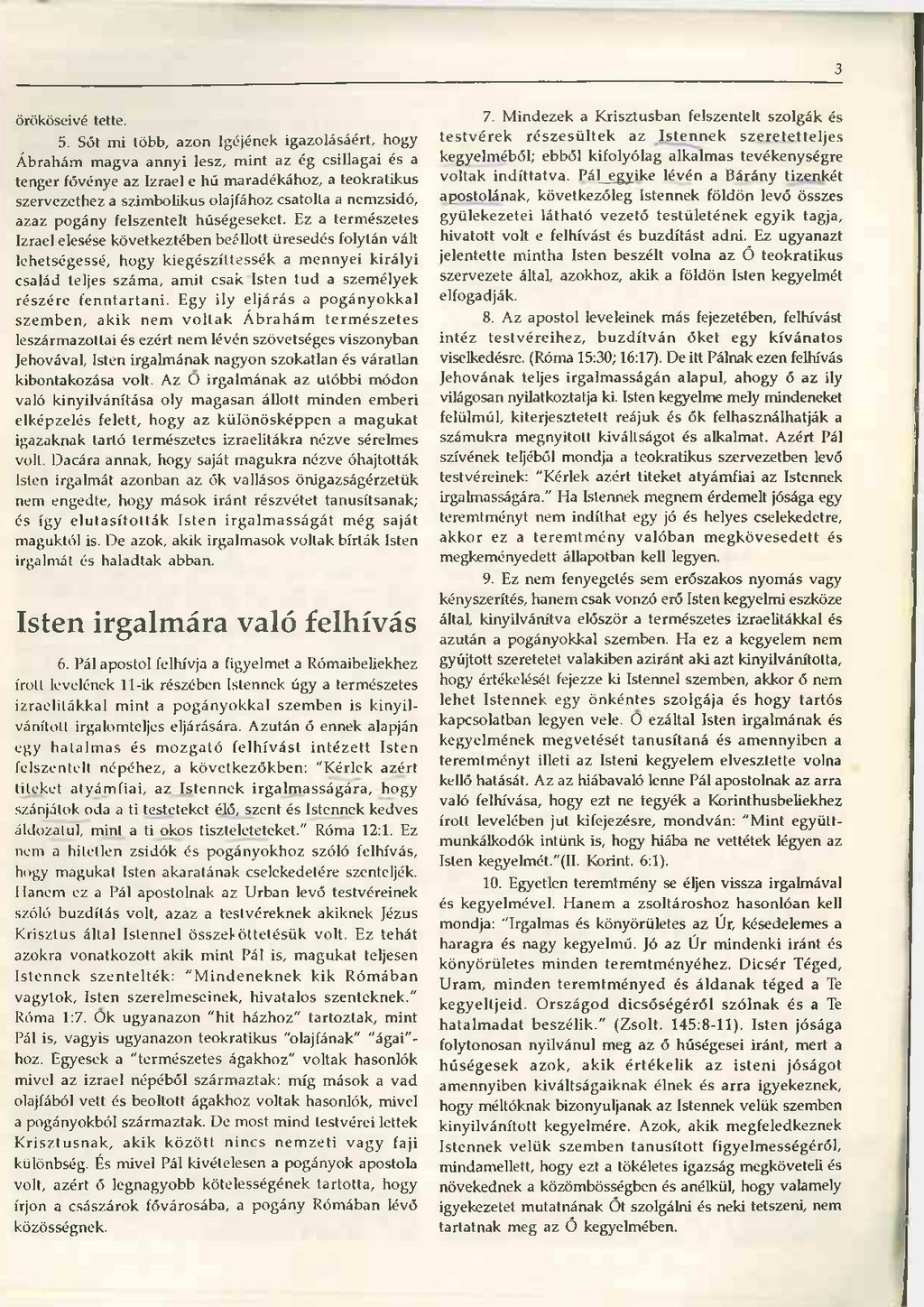 5 Sőt mi több, azon Igéjének igazolásáért, hogy Ábrahám magva annyi lesz, mint az ég csillagai és a tenger fővénye az Izrael e hű maradékához, a teokratikus szervezethez a szimbolikus olajfához csatolta a nemzsidó, azaz pogány felszentelt hűségeseket. Ez a természetes Izrael elesése következtében beállott üresedés folytán vált lehetségessé, hogy kiegészíttessék a mennyei királyi család teljes száma, amit csak Isten tud a személyek részére fenntartani. Egy ily eljárás a pogányokkal szemben, akik nem voltak Ábrahám természetes leszármazottai és ezért nem lévén szövetséges viszonyban Jehovával, Isten irgalmának nagyon szokatlan és váratlan kibontakozása volt. Az Ő irgalmának az utóbbi módon való kinyilvánítása oly magasan állott minden emberi elképzelés felett, hogy az különösképpen a magukat igazaknak tartó természetes izraelitákra nézve sérelmes volt. Dacára annak, hogy saját magukra nézve óhajtották Isten irgalmát azonban az ők vallásos önigazságérzetük nem engedte, hogy mások iránt részvétet tanúsítsanak; és így elutasították Isten irgalmasságát még saját maguktól is. De azok, akik irgalmasok voltak bírták Isten irgalmát és haladtak abban.