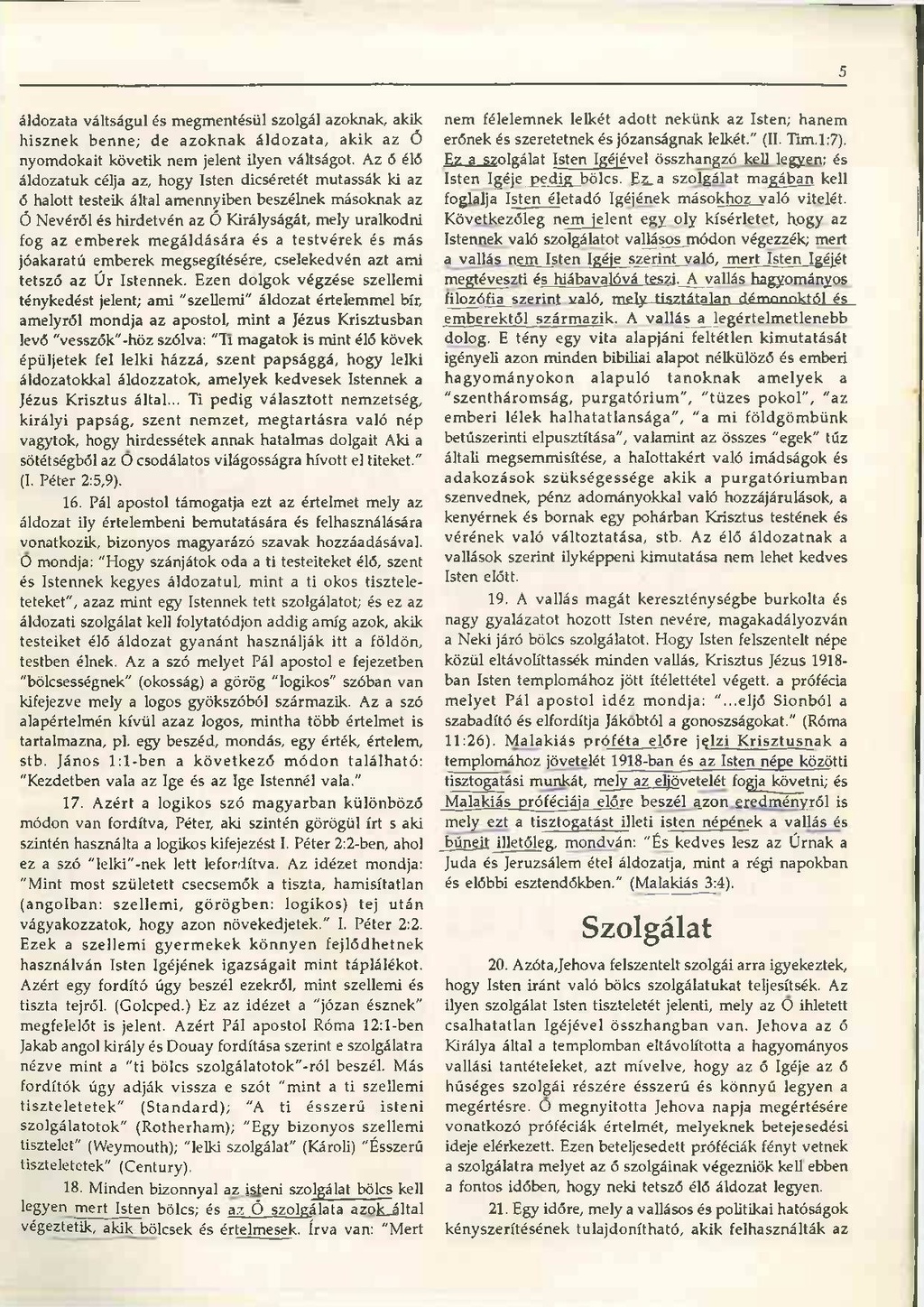 20 Azóta,Jehova felszentelt szolgái arra igyekeztek, hogy Isten iránt való bölcs szolgálatukat teljesítsék. Az ilyen szolgálat Isten tiszteletét jelenti, mely az Ő ihletett csalhatatlan Igéjével összhangban van. Jehova az ő Királya által a templomban eltávolította a hagyományos vallási tantételeket, azt mívelve, hogy az ő Igéje az ő hűséges szolgái részére ésszerű és könnyű legyen a megértésre. Ő megnyitotta Jehova napja megértésére vonatkozó próféciák értelmét, melyeknek betejesedési ideje elérkezett. Ezen beteljesedett próféciák fényt vetnek a szolgálatra melyet az ő szolgáinak végezniök kell ebben a fontos időben, hogy neki tetsző élő áldozat legyen.