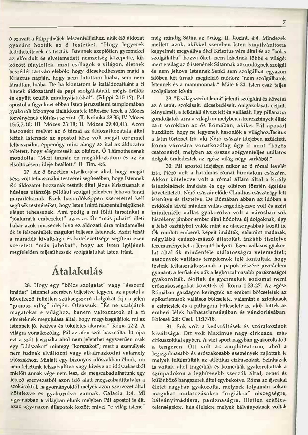 30 Pál apostol idejében mikor az ő római levelét írta, Néró volt a hatalmas római birodalom császára. Akkor kötelezve volt a római állam által a király istenítésének imádata és egy oltáron tömjén égetése követeltetett. Néró császár előde Claudius császár így lett istenítve és tisztelve. De Rómában abban az időben a zsidókén kivül minden vallás engedélyezve volt és azért mindenféle vallás gyakorolva volt a városban sok hiszékeny jámbor ember által hódolva új dolgoknak, úgy a felső osztályból valók mint az alacsonyabbak közül is. Ők romlott emberek képeit imádták, valamint madarak, négylábú csúszó-mászó állatokat, inkább tisztelve teremtményeket a Teremtő helyett. Ezen vallásos gyakor­lat által ők mindenféle utálatosságra vetemedtek; asszonyok vallásos templomok felé fordultak, hogy testeik felhasználtassanak a papok részére jövedelem gyanánt; a férfiak és nők a legborzalmasabb paráznaságot gyakorolták, férfiak és gyermekek sodomai nemi erőszakosságokat követtek el. Róma 1:23-27. Az egész Rómában gazdagon keringtek az emberi bölcseletek az epikurienusok vallásos bölcselete, valamint a sztoikusok a csinicsiek és a pithagora bölcseleté is, akik hittek az emberi lélek halhatatlanságában és vándorlásában. Kolossé 2:8; Csel. 11:17-18.