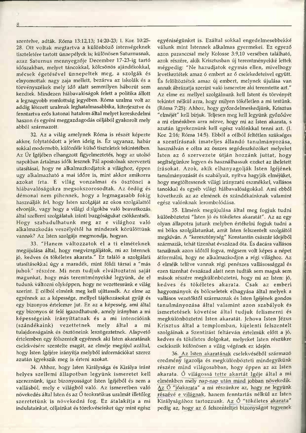 35 Elménk megújulása által meg fogjuk tudni különböztetni "Isten jó és tökéletes akaratát". Az az egy olyan állapotra jutunk melyben értékelni fogjuk tudni a mi bölcs szolgálatunkat, amit Isten felszentelt szolgáitól megkíván. A "kereszténység" Konstantin császár idejéből származik, tehát tizenhat évszázad óta. És dacára vallásos tanaiknak azon időtől fogva, mégsem volt képes a népet átformálni, hogy ne alkalmazkodjon a régi világhoz. Az ő elméik telítve vannak régi penészes vallásossággal és ezen tizenhat évszázad alatt nem tudták sem maguk sem mások részére megkülönböztetni, hogy mi az Isten: jó, kedves és tökéletes akarata. Csak az emberi hagyományok és bölcseletek elhagyása által melyek a vallásos vezetőktől származnak és Isten Igéjének gondos tanulmányozása által valamint azon szabályok és ismertetések követése által tudjuk felismerni és megkülönböztetni Isten akaratát. Jehova Isten Jézus Krisztus által a templomban, kijelenti felszentelt szolgáinak a Szentírást feltárván értelmük előtt a jó, kedves és tökéletes dolgokat, melyeket Isten részükre cselekszik különösen a világ végének ez idején.