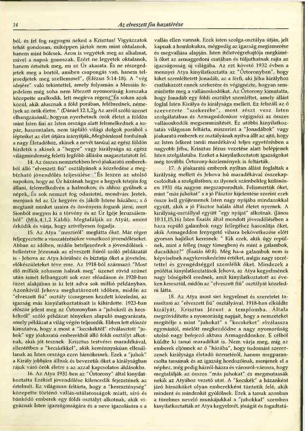 vallás ellen vannak. Ezek isten szolga-osztálya útján, jelt kapnak a homlokukra, mégpedig az igazság megismerése és megvallása alapján. Isten ítéletvégrehajtója megkíméli őket az armaggedoni csatában és túljuthatnak rajta az igazságosság új világába. Az ezt követő 1932 évben a mennyei Atya kinyilatkoztatta az "Őrtoronyban", hogy kiket szemléltetett Jonadáb, az a férfi, aki Jéhu királyhoz csatlakozott ennek szekerére és végignézte, hogyan semmisítette meg a vallásoskodókat. Az Őrtorony kimutatta, hogy Jonadáb egy földi osztályt szemléltet, amely állást foglal Isten Királya és királysága mellett. Ez felszáll az ő szervezete "szekerébe", most részt vesz Isten szolgálatában és Armageddonkor végignézi az összes vallásoskodók megsemmisítését. Ez utóbbi kinyilatkoztatás világosan feltárta, miszerint a "Jonadábok" vagy jóakaratú emberek ez osztályának nyitva állt az ajtó, hogy az Isten felkent tanúi mardékával teljes egyetérésben a nagyobb Jéhu, Krisztus Jézus vezetése alatt belépjenek Isten szolgálatába. Ezeket a kinyilatkoztatott igazságokat még további Őrtorony-közlemények is feltárták.