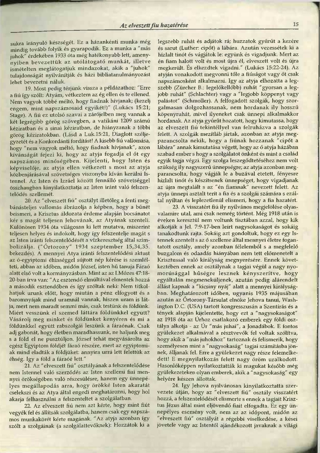 Így Jehova nyilvánosan kinyilatkoztatta szervezete útján, hogy az "elveszett fiú" osztály visszatért hozzá, a felszentelődését elismerte s ennek a tagjait Krisztus Jézus által mint eljövendő fiait elfogadta. Ez egy ünnepélyes esemény volt, nem az az időpont, midőn az "elveszett fiú" osztályát a régebbi viselkedése, a kései jövetele vagy az Istentől ajándékozott javaknak a világi
