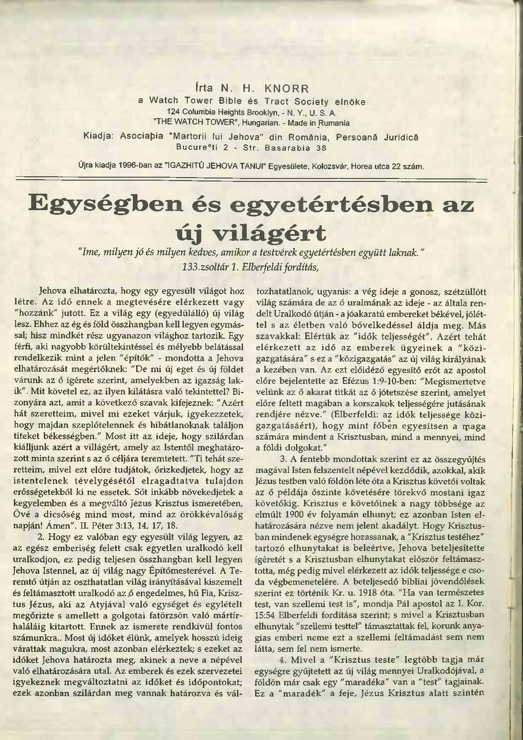 Újra kiadja 1996-ban az "IGAZHITŰ JEHOVA TANÚI" Egyesülete, Kolozsvár, Horea utca 22 szám.