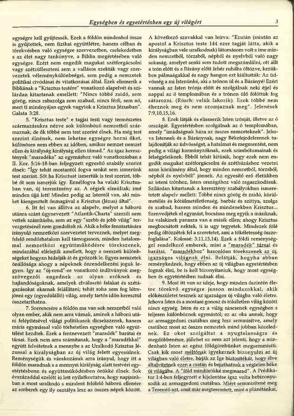 egységre kell gyűjtessék. Ezek a földön mindenhol össze is gyűjtettek, nem fizikai együttlétre, hanem célban és törekvésben való egységre szervezetben, cselekedetben s az élét nagy tankönyve, a Biblia megértésében való egységre. Ezért nem engedik magukat szétforgácsolni vagy szétzülleszteni sem a vallásos szekták vagy szervezetek véleménykülönbségei, sem pedig a nemzetek politikai civódásai és vitatkozásai által. Ezek elismerik a Bibliának a "Krisztus testére" vonatkozó alapelvét és szilárdan kitartanak emellett: "Nincs többé zsidó, semn görög, nincs rabszolga sem szabad, nincs férfi, sem nő, mert ti mindnyájan egyek vagytok a Krisztus Jézusban". Galata 3:28.
