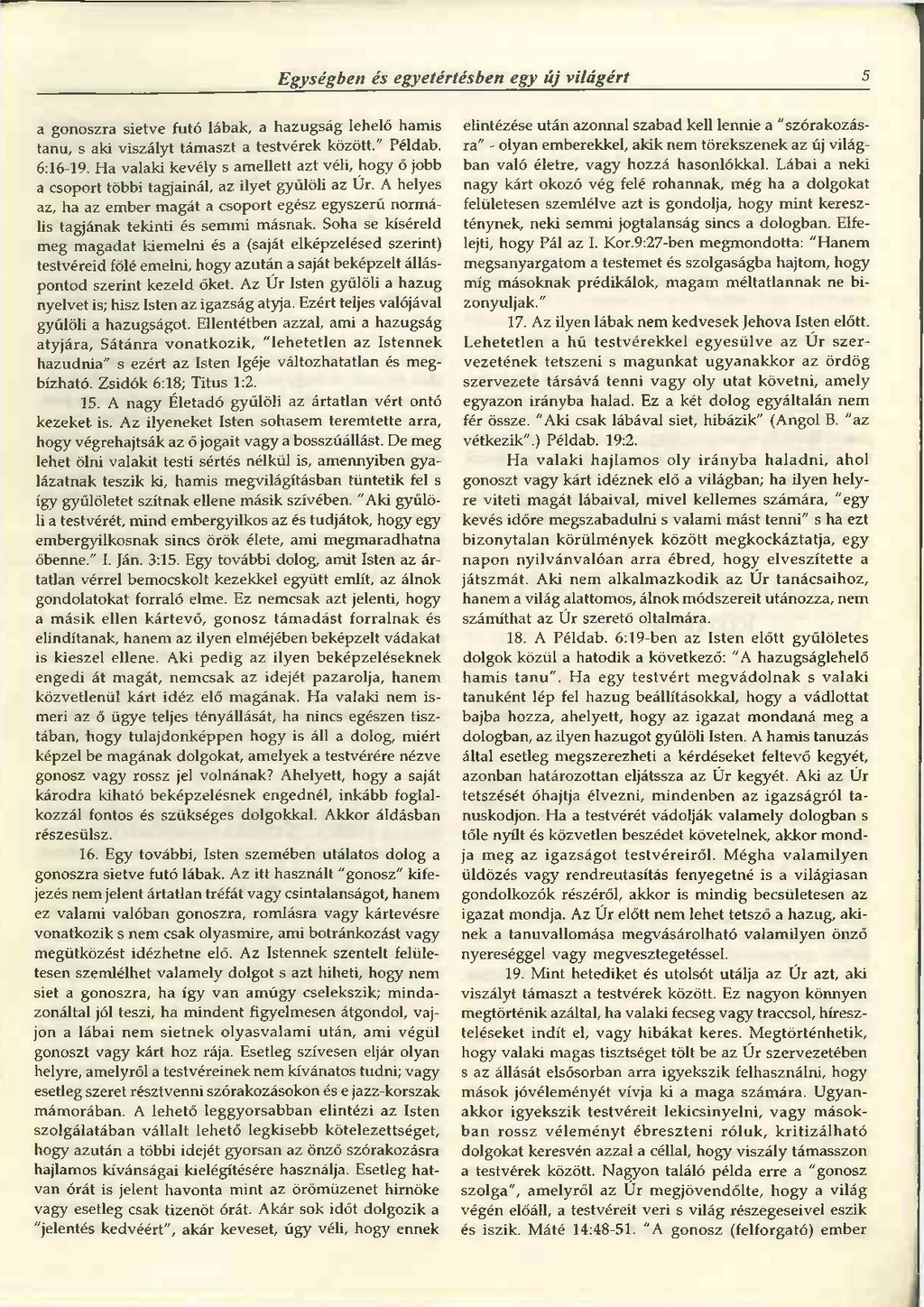 16 Egy további, Isten szemében utálatos dolog a gonoszra sietve futó lábak. Az itt használt "gonosz" kifejezés nem jelent ártatlan tréfát vagy csintalanságot, hanem ez valami valóban gonoszra, romlásra vagy kártevésre vonatkozik s nem csak olyasmire, ami botránkozást vagy megütközést idézhetne elő. Az Istennek szentelt felületesen szemlélhet valamely dolgot s azt hiheti, hogy nem siet a gonoszra, ha így van amúgy cselekszik; mindazonáltal jól teszi, ha mindent figyelmesen átgondol, vajjon a lábai nem sietnek olyasvalami után, ami végül gonoszt vagy kárt hoz rája. Esetleg szívesen eljár olyan helyre, amelyről a testvéreinek nem kívánatos tudni; vagy esetleg szeret résztvenni szórakozásokon és e jazz-korszak mámorában. A lehető leggyorsabban elintézi az Isten szolgálatában vállalt lehető legkisebb kötelezettséget, hogy azután a többi idejét gyorsan az önző szórakozásra hajlamos kívánságai kielégítésére használja. Esetleg hatvan órát is jelent havonta mint az örömüzenet hírnöke vagy esetleg csak tizenöt órát. Akár sok időt dolgozik a "jelentés kedvéért", akár keveset, úgy véli, hogy ennek