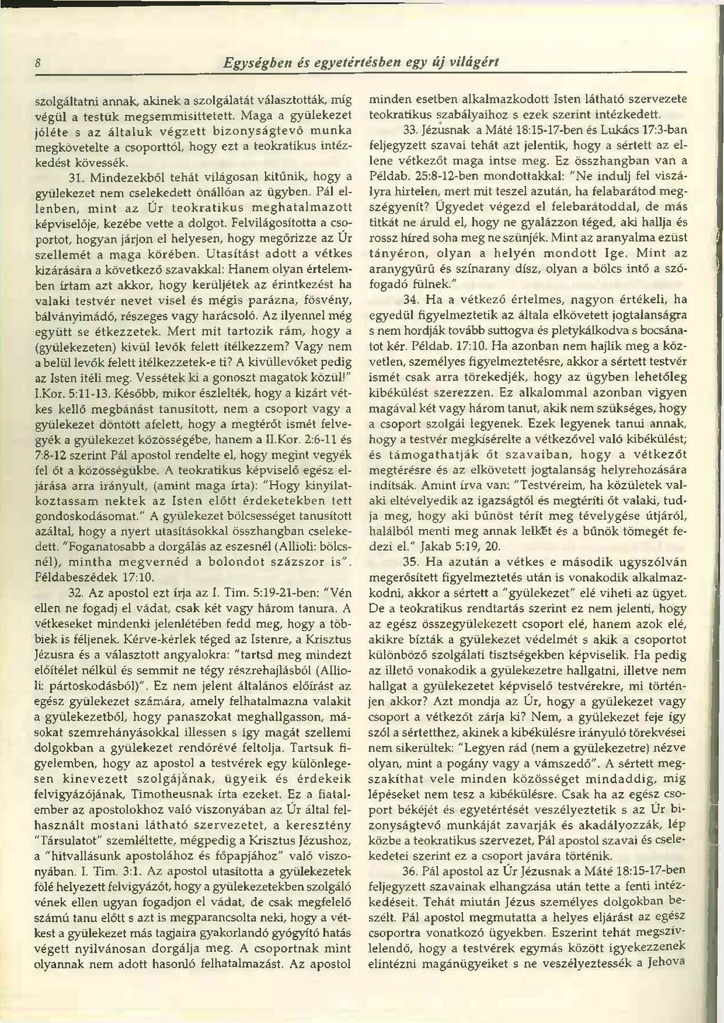 32 Az apostol ezt írja az I. Tim. 5:19-21-ben: "Vén ellen ne fogadj el vádat, csak két vagy három tanúra. A vétkeseket mindenki jelenlétében fedd meg, hogy a többiek is féljenek. Kérve-kérlek téged az Istenre, a Krisztus Jézusra és a választott angyalokra: "tartsd meg mindezt előítélet nélkül és semmit ne tégy részrehajlásból (Allioli: pártoskodásból)". Ez nem jelent általános előírást az egész gyülekezet számára, amely felhatalmazna valakit a gyülekezetből, hogy panaszokat meghallgasson, másokat szemrehányásokkal illessen s így magát szellemi dolgokban a gyülekezet rendőrévé feltolja. Tartsuk figyelemben, hogy az apostol a testvérek egy különlegesen kinevezett szolgájának, ügyeik és érdekeik felvigyázójának, Timotheusnak írta ezeket. Ez a fiatal ember az apostolokhoz való viszonyában az Úr által felhasznált mostani látható szervezetet, a keresztény "Társulatot" szemléltette, mégpedig a Krisztus Jézushoz, a "hitvallásunk apostolához és főpapjához" való viszonyában. I. Tim. 3:1. Az apostol utasította a gyülekezetek fölé helyezett felvigyázót, hogy a gyülekezetekben szolgáló vének ellen ugyan fogadjon el vádat, de csak megfelelő számú tanú előtt s azt is megparancsolta neki, hogy a vétkest a gyülekezet más tagjaira gyakorlandó gyógyító hatás végett nyilvánosan dorgálja meg. A csoportnak mint olyannak nem adott hasonló felhatalmazást. Az apostol