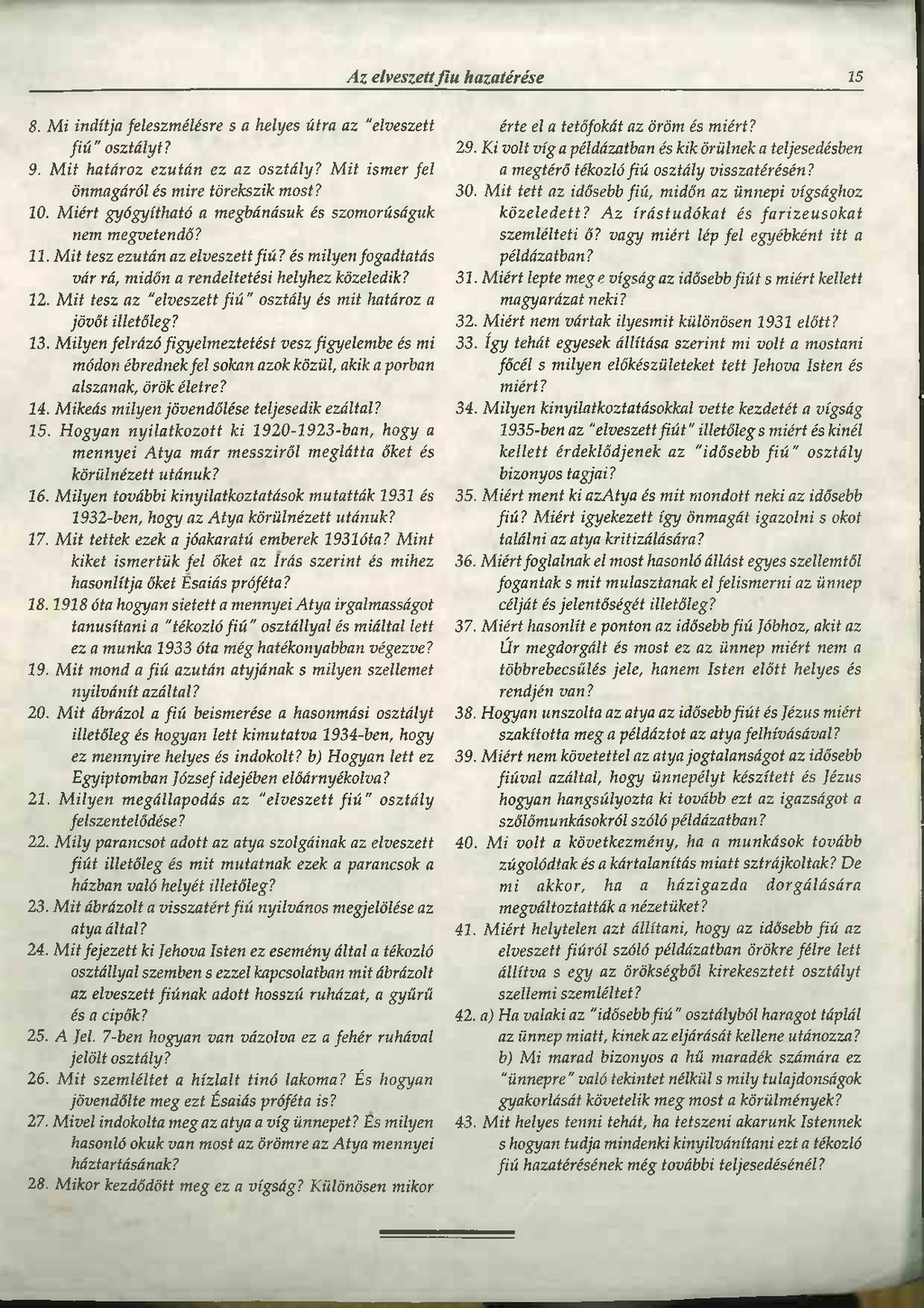 42 a) Ha valaki az "idősebb fiú" osztályból haragot táplál az ünnep miatt, kinek az eljárását kellene utánozza? b) Mi marad bizonyos a hű maradék számára ez “ünnepre" való tekintet nélkül s mily tulajdonságok gyakorlását követelik meg most a körülmények?