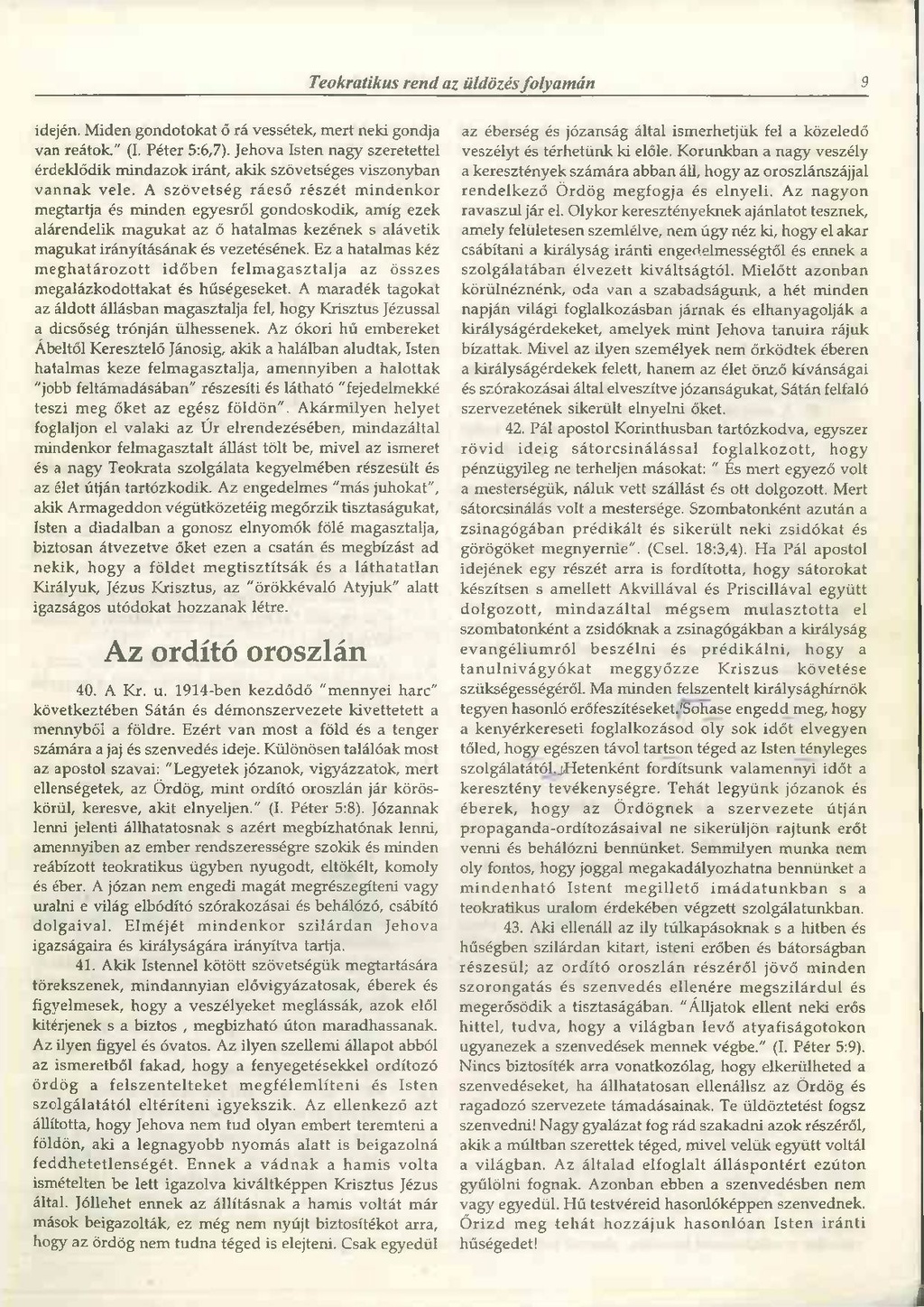 40 A Kr. u. 1914-ben kezdődő "mennyei harc" következtében Sátán és démonszervezete kivettetett a mennyből a földre. Ezért van most a föld és a tenger számára a jaj és szenvedés ideje. Különösen találóak most az apostol szavai: "Legyetek józanok, vigyázzatok, mert ellenségetek, az Ördög, mint ordító oroszlán jár körös körül, keresve, akit elnyeljen." (I. Péter 5:8). Józannak lenni jelenti állhatatosnak s azért megbízhatónak lenni, amennyiben az ember rendszerességre szokik és minden reábízott teokratikus ügyben nyugodt, eltökélt, komoly és éber. A józan nem engedi magát megrészegíteni vagy uralni e világ elhódító szórakozásai és behálózó, csábító dolgaival. Elméjét mindenkor szilárdan Jehova igazságaira és királyságára irányítva tartja.